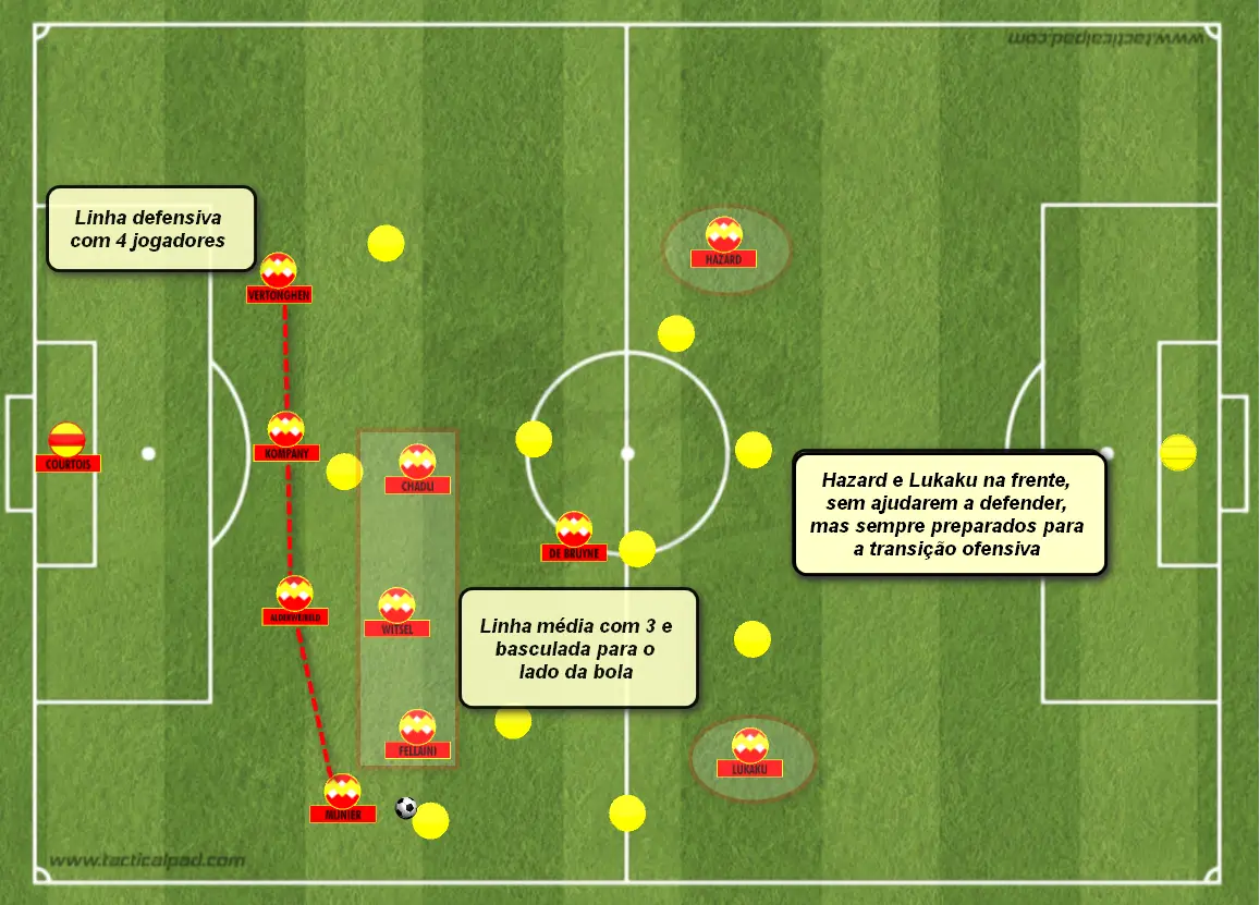 Deste modo, em vez da linha defensiva composta por cinco jogadores, com que a Bélgica costumava defender, Roberto Martínez apresentou uma linha defensiva apenas com quatro jogadores, optando por ter sempre três médios no corredor central, que basculavam para os corredores laterais quando era necessário ajudar o respetivo lateral, uma vez que Lukaku e Hazard, que jogaram mais sobre os corredores laterais, raramente baixavam para ajudar nas tarefas defensivas, preocupando-se apenas com o momento ofensivo.